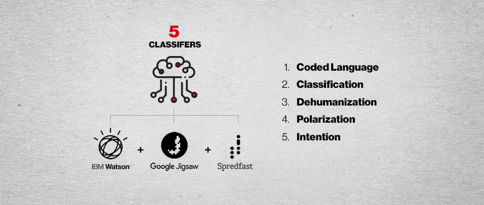 We created 5 proprietary classifiers then wove together three discrete technologies into a new AI platform that classifies and rates the toxicity of hate.